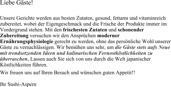 ImpressumSushi-AspernP&M Food GmbH1220 Wien, Gross-Enzersdorferstrasse 2Tel: +4312808584 E-mail: office@sushi-aspern.atUID Nummer: ATU 70446029, Gerichtstand WienKammerzugehörigkeit: Wirtschaftskammer, Fachgruppe GastronomieDie auf dieser Website befindlichen Informationen wurden nach bestem Wissen und Gewissen sorgfältig zusammengestellt und geprüft. Eine Gewähr oder Haftung für die Informationen, insbesondere für deren Richtigkeit, Vollständigkeit, Aktualität oder jederzeitige Verfügbarkeit, kann jedoch nicht übernommen werden. Jegliche Haftung für Schäden, die sich aus der Verwendung der abgerufenen Informationen ergeben, wird - soweit gesetzlich zulässig - ausgeschlossen. Die Website enthält auch Links oder Verweise auf andere Websites. Sushi-Aspern ist für den Inhalt dieser anderen Websites nicht verantwortlich, distanziert sich davon und macht sich diesen Inhalt auch nicht zu Eigen. Sushi-Aspern behält sich das Recht vor, ohne vorherige Ankündigung die bereitgestellten Informationen zu ergänzen, zu ändern oder zu entfernen. DatenschutzHaftungshinweisDie Eingabe persönlicher oder geschäftlicher Daten (Emailadressen, Namen, Anschriften) erfolgt seitens des Nutzers auf ausdrücklich freiwilliger Basis. Die Nutzung der im Rahmen des Impressums oder vergleichbarer Angaben veröffentlichten Kontaktdaten wie Postanschriften, Telefon- und Faxnummern sowie Emailadressen durch Dritte zur übersendung von nicht ausdrücklich angeforderten Informationen ist nicht gestattet. Sushi-Aspern wird Ihre personenbezogenen Daten in keinem Falle an Dritte verkaufen oder vermieten.Rechtliche Schritte gegen die Versender von sogenannten Spam-Mails bei Verstössen gegen dieses Verbot sind ausdrücklich vorbehalten.Datenspeicherungzum Zweck der Rservierung oder online bestellung (Telefon, E-Mail oder Reservierungsapp)werden Name, E-Mail und Telefonnummer zur Vertragsabwickiung gespeichert.Datenübermittelung an Dritte erfolgt nicht, mit Ausnahme von Übermittelung der Kreditendatenbei Kartenzahlung an die abwickelnden Bankinstitut / Zahlungdienstleister zum Zweck der Abbuchung der Konsumation im Restaurant, sowie an unseren Steuerberatern zur Erfüllung der steuerlichen Verpflichtungen.Hausordnung•Das Mitbringen von Speisen und Getränken ist nicht gestattet•Den Anweisung des personals ist im Notfall Folge zu leisten•sichtlich angetrunkenen Gästen wirden der Eintritt nicht gewährt•Reservierung wird bei nicht erscheinen zum reservierten Zeitpunkt nach 15 Minuten storniert•Kinder bis 18 Jahren haben der Beaufsichtigung eines Erwachsenen zu unterstehen•Eltern haften ihre Kinder im Restaurant